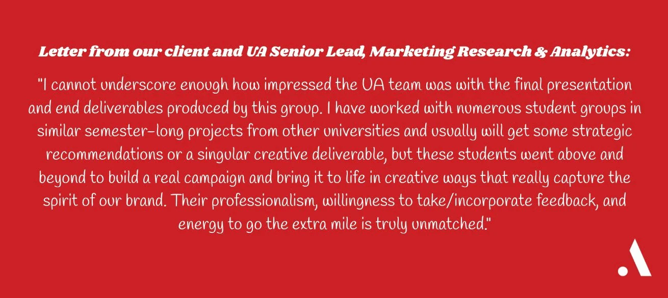 During Spring 2024, I worked as a copywriter for Boston University AdLab, the largest student-run ad agency in the nation, on the Under Armour account.